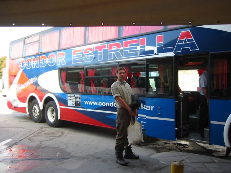 Heute ging es einigermassen frueh wieder mit dem Bus weiter, die restlichen 510 km wurden auch in 7 Stunden geschafft. Unterwegs sind wir an meinem Albtraum fuer diese Fahrt vorbei gekommen. Die Busse sind das Hauptverkehrsmittel in Argentinien. Auf der Gegenfahrbahn lag ein Bus gleicher bauweise auf der Seite, alle Fenster aufgeplatzt und war nach den Russspuren an der Unterseite zu urteilen kurzzeitig in Brand geraten. Doch uns ist zum Glueck nichts passiert, wir sind heile hier angekommen. Nun koennen wir “nur noch” hier irgendwie unter die Raeder kommen (das ist eine verrueckter Verkehr in diesem Land!).